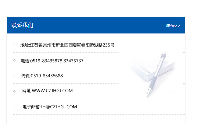 地址:常州市新北區(qū)友邦商務(wù)大廈1幢16、17層  電話:0519-85101652  傳真:0519-85112595  郵編:213022  網(wǎng)址:www.cz-jiayue_cn.guangyu98.com  郵箱:xiajifengaa@163.com